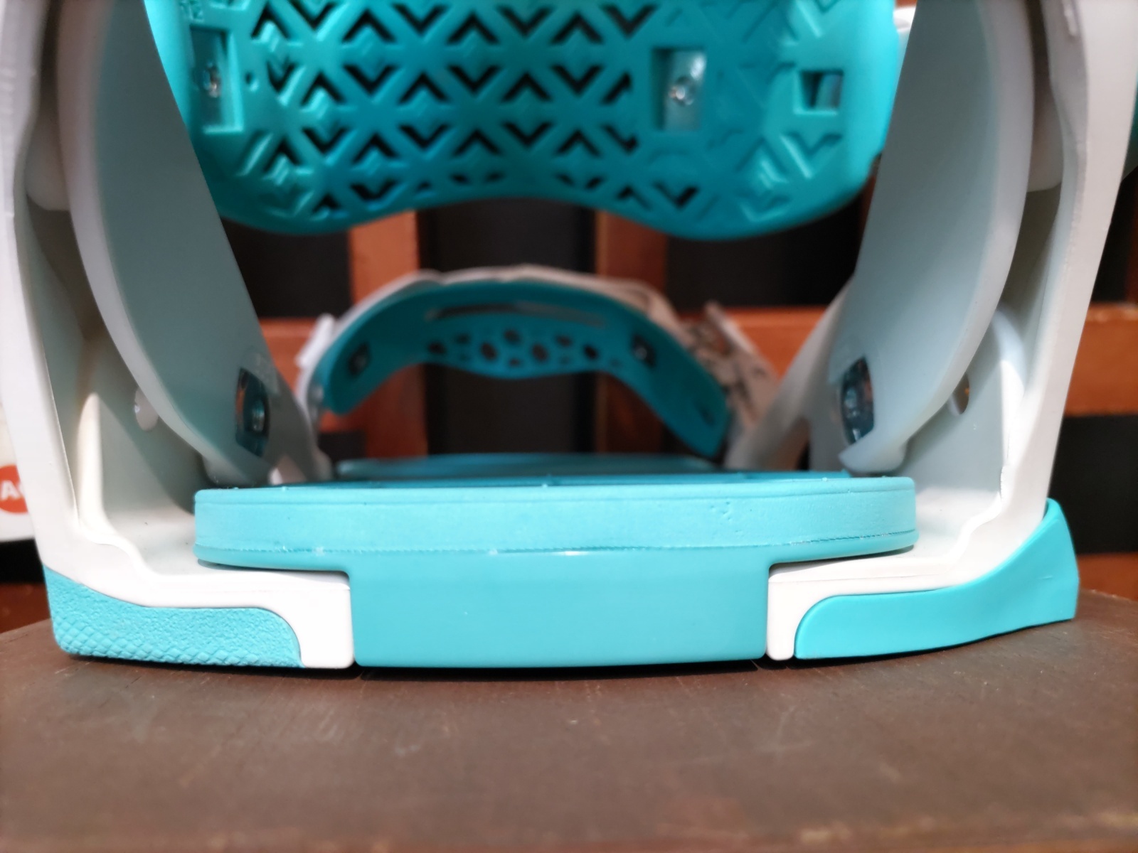 踵のクッションも内側が柔らかく外側が硬いため、自然とボードの中心へ身体のポジションが導かれ、内側への自由度もアップします。